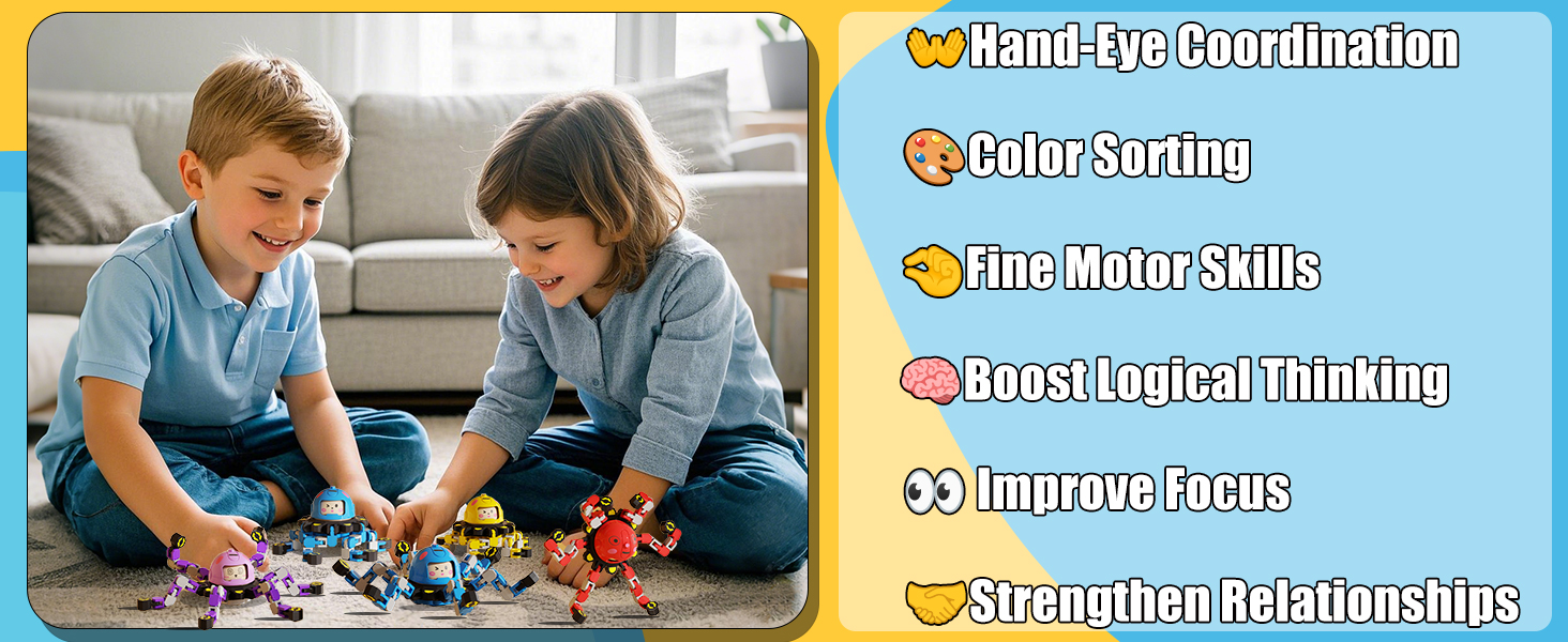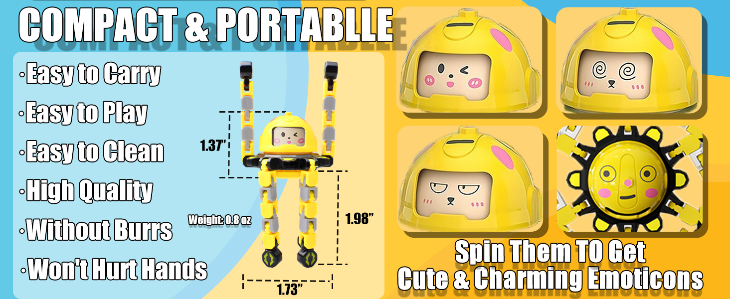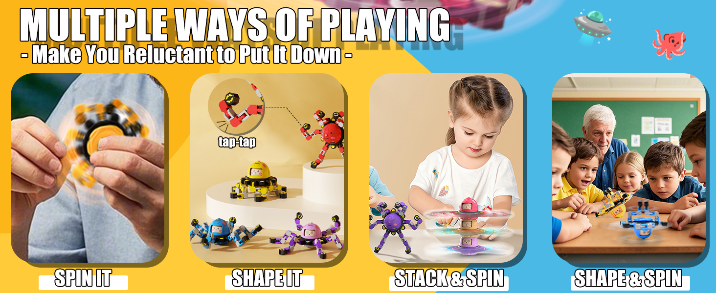 Innovative Transformable Sprite Spinner Toy Design - Our toys feature vibrant colors 🌈 and multiple ways to play. Each spinner has 6 transformable faces, each rotatable and lockable into position 🔒. Perfect for children aged 3 and up 👶 and adults, they can create different shapes like cool spinners 🌀, robots 🤖, or even phone stands📱. This enhances fine motor skills 🤲, hand-eye coordination 🕵️‍♂️, and logical thinking abilities 🧠. It also serves as an excellent comfort toy and stress reliever 😌.